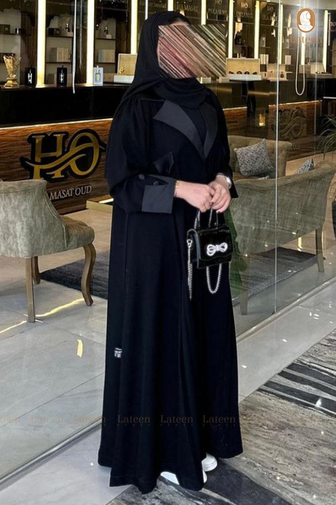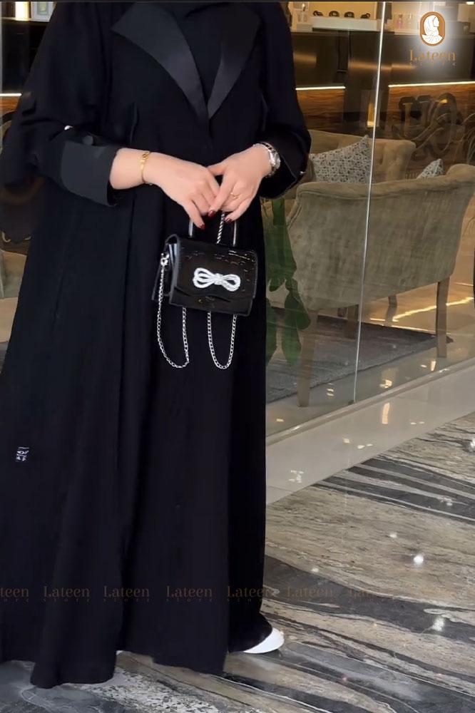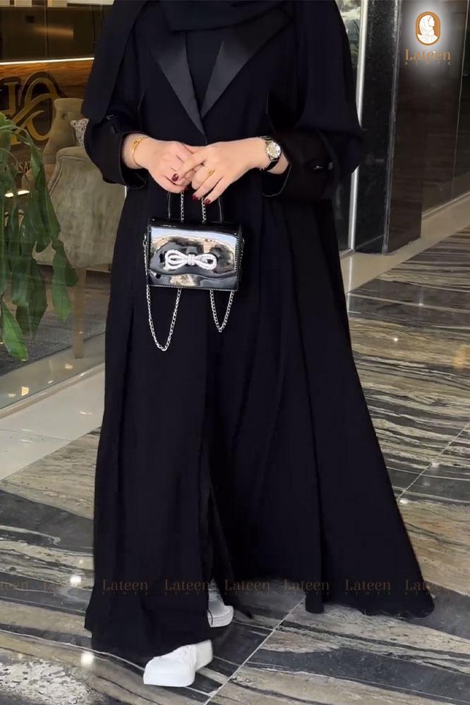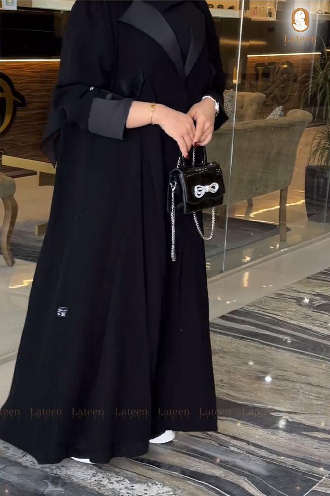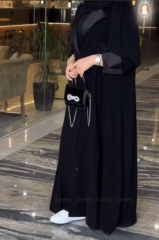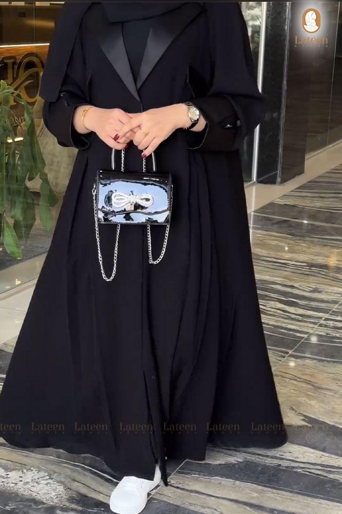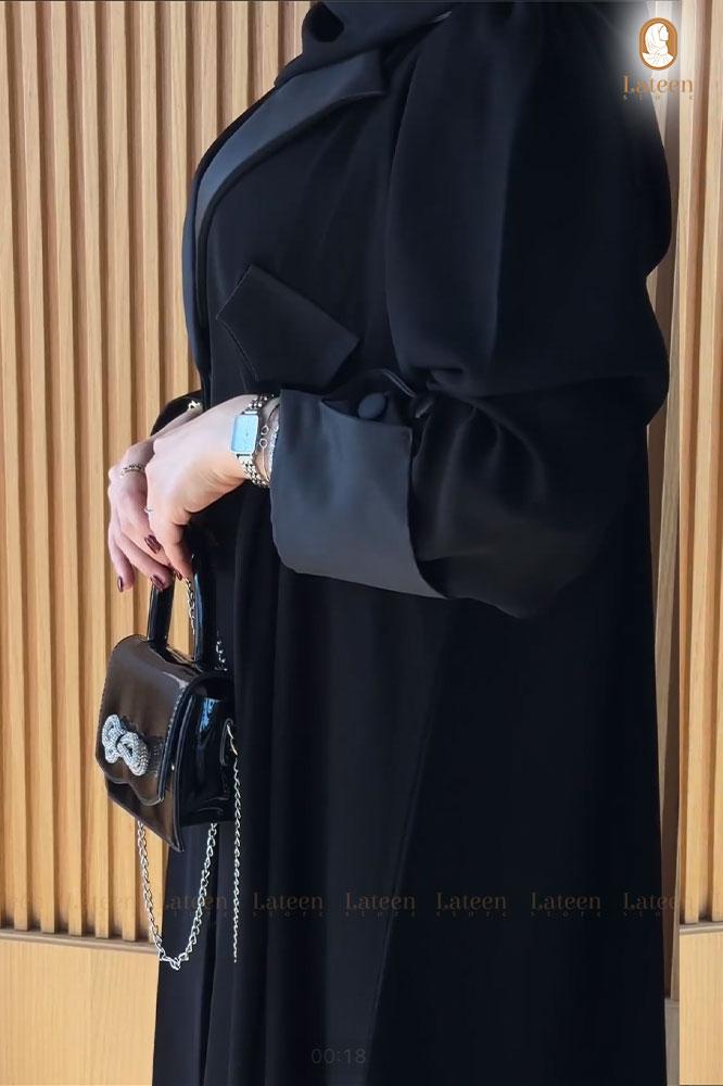 عباية بليزر اسود بكسرات امامية مع ستان من لتين ستور